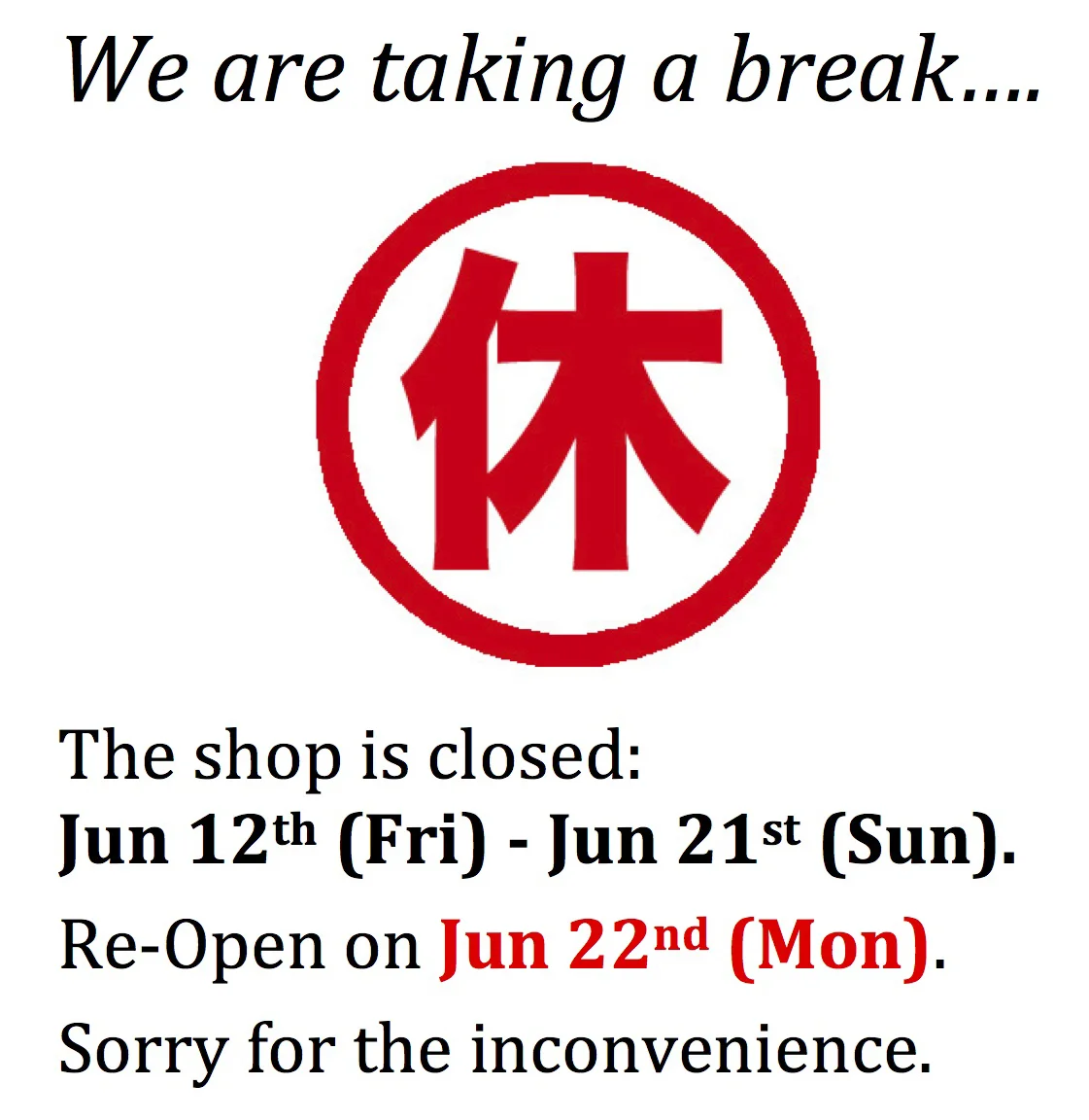 We are taking a short holiday.  The shop will be closed from Jun 12th (Fri) to Jun 21st (Sun).  We will come back refreshed (and jet lagged!) and re-open on Jun 22nd (Mon)